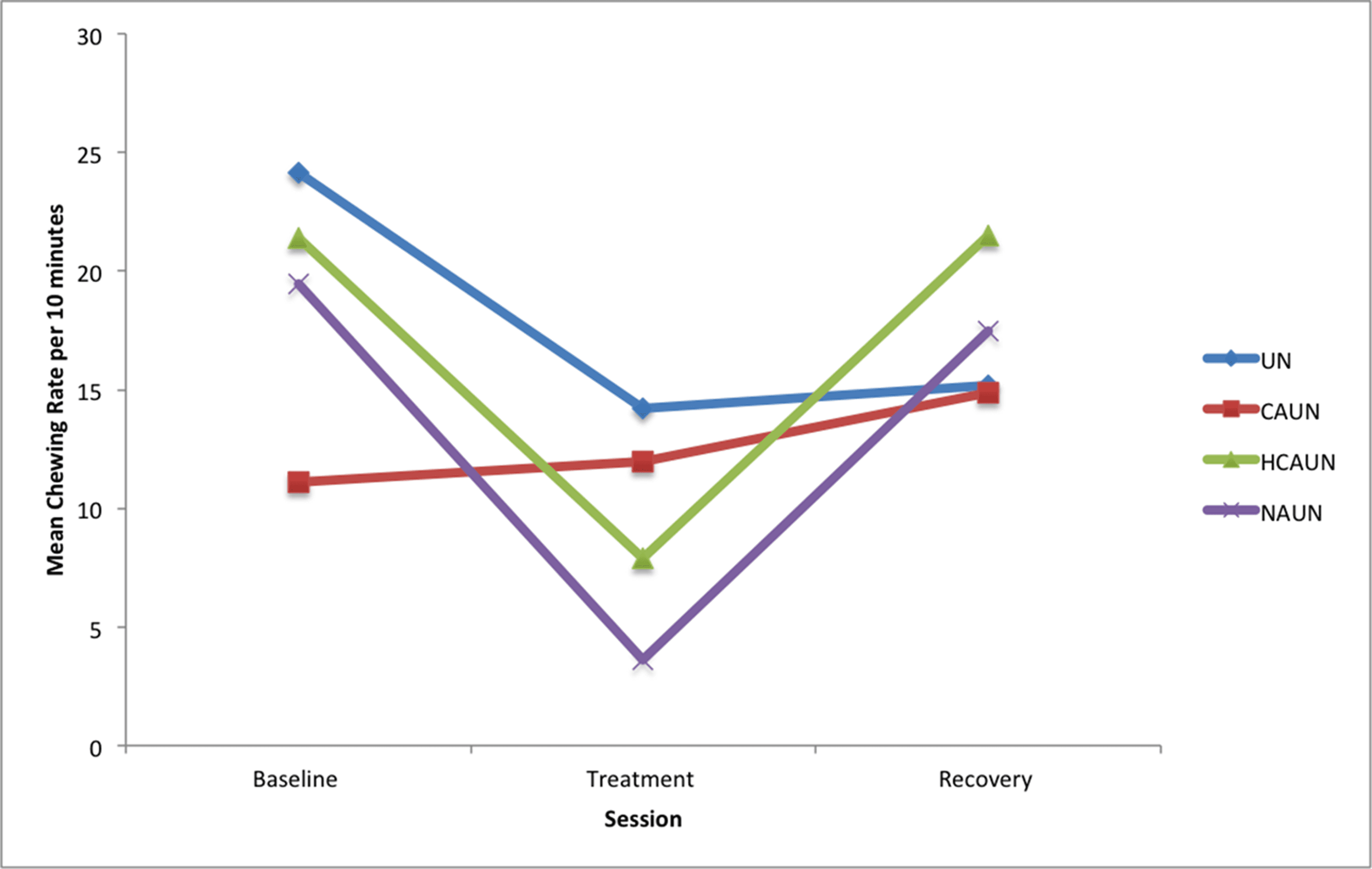 - Présence d’un rebond post-inhibiteur pour l’ensemble des comportements oraux (fréquence du comportement supérieure à la période d’observation, après une période d’inhibition). Toutefois, quelle est la part liée au mors, et celle liée à une réelle inhibition, par exemple pour le mâchouillement ?
